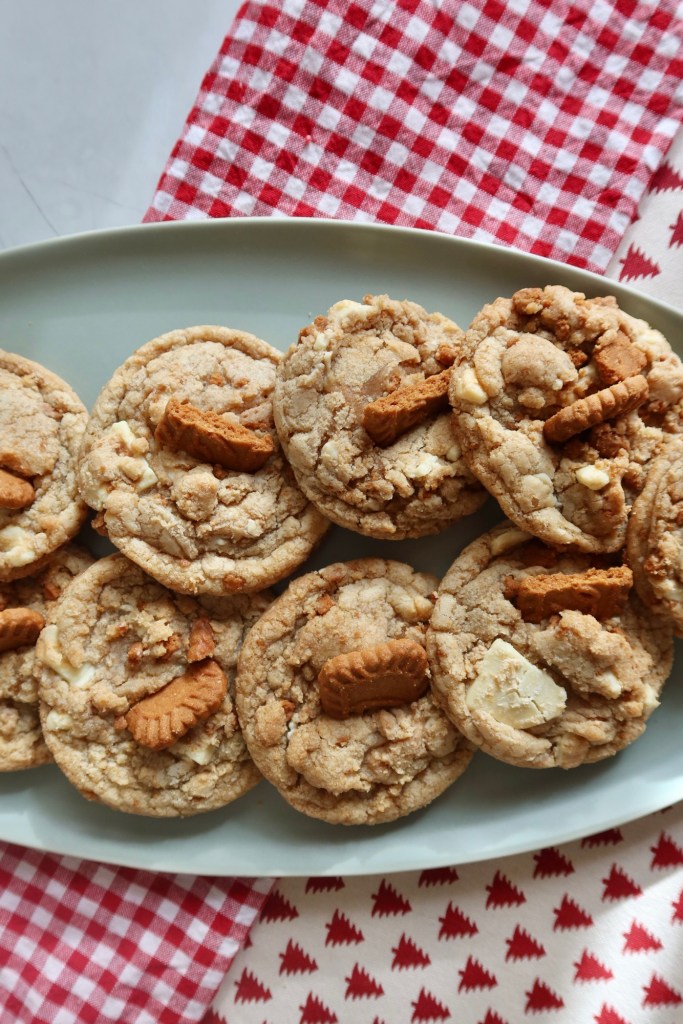 Welcome to 12 days of Christmas Cookies, my way of celebrating the holidays by sharing with you all 12 unique yet nostalgic cookie recipes to bake over the holidays. For day 8 I am sharing these Biscoff Chocolate Bark Cookies and you are going to be OBSESSED, proceed with caution!! These cookies use one of my perfect, buttery soft cookie dough recipes enhanced with a white chocolate biscoff bark and crushed biscoff cookies. My Mom LOVES anything biscoff, and that has inspired me to bake with Biscoff in all it’s glory for a holiday cookie recipe that is a little different than the norm. This cookie does have the added step of making the chocolate biscoff bark, but it is oh so worth it!